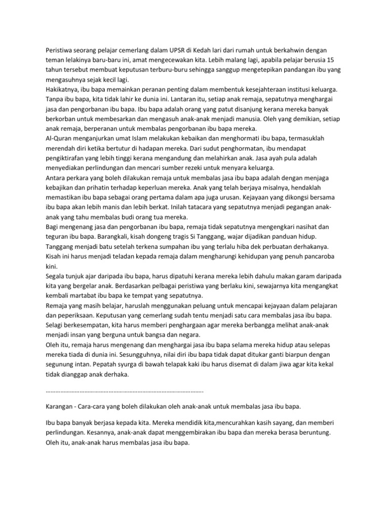 Itulah apa yang ibu bapa anda mahukan. .bapa bagai menghitung rambut di kepala adalah kita tidak bisa membalas perbuatan ibu dan ayah kita karena jasanya sangat besar kepada kita dan mereka telah menjaga, merawat cara agar dapat memahami pelajaran untuk ulangan dengan cepat dan baik?.tolong aku, karena udah mau ukk. Kejayaan yang cemerlang dalam upsr sudah tentu mampu menggembirakan ibu bapa kita. Kerangka karangan cara membalas jasa ibu bapa mp3 & mp4. Ibu bapa merupakan insan yang banyak berjasa kepada kita. Peluk cium ibu bapa anda walaupun anda sudah besar dewasa. Sebagai anak kita perlu membalas jasa mereka dari sekarang hingga kita sudah dewasa kelak. Pelbagai cara boleh kita lakukan untuk membalas jasa mereka. Contextual translation of cara cara membalas jasa ibu bapa into english. Cara membalas jasa ibu bapa dengan mengingati tarikh penting mereka ini amat jarang dilakukan oleh ramai anak. Saya tidak mahu beritahu kamu sebab saya belum cukup yakin pada kamu. Natijahnya, bersikap murah hati terhadap ibu dan bapa merupakan antara cara kita membalas jasa mereka. Encourage, how to make, how to care, lousy means.